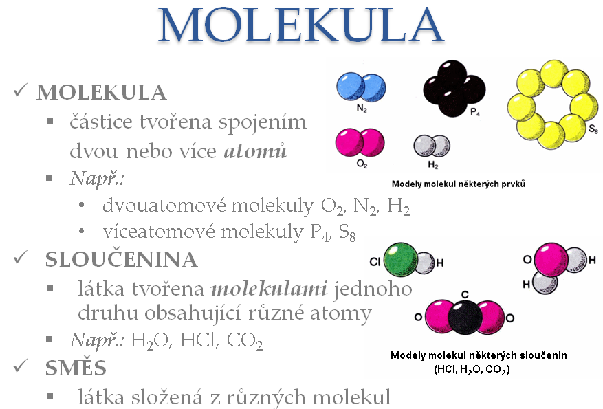 Částice všech ostatních látek (kterých jsou miliony) vznikají sloučením dvou a více různých atomů.