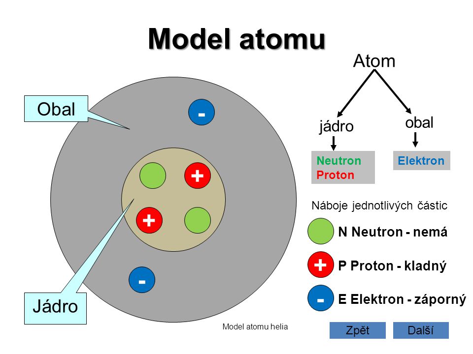 Atomové jádro je složeno z kladně nabitých protonů (p+ ) a elektricky neutrálních neutronů (n0 ).