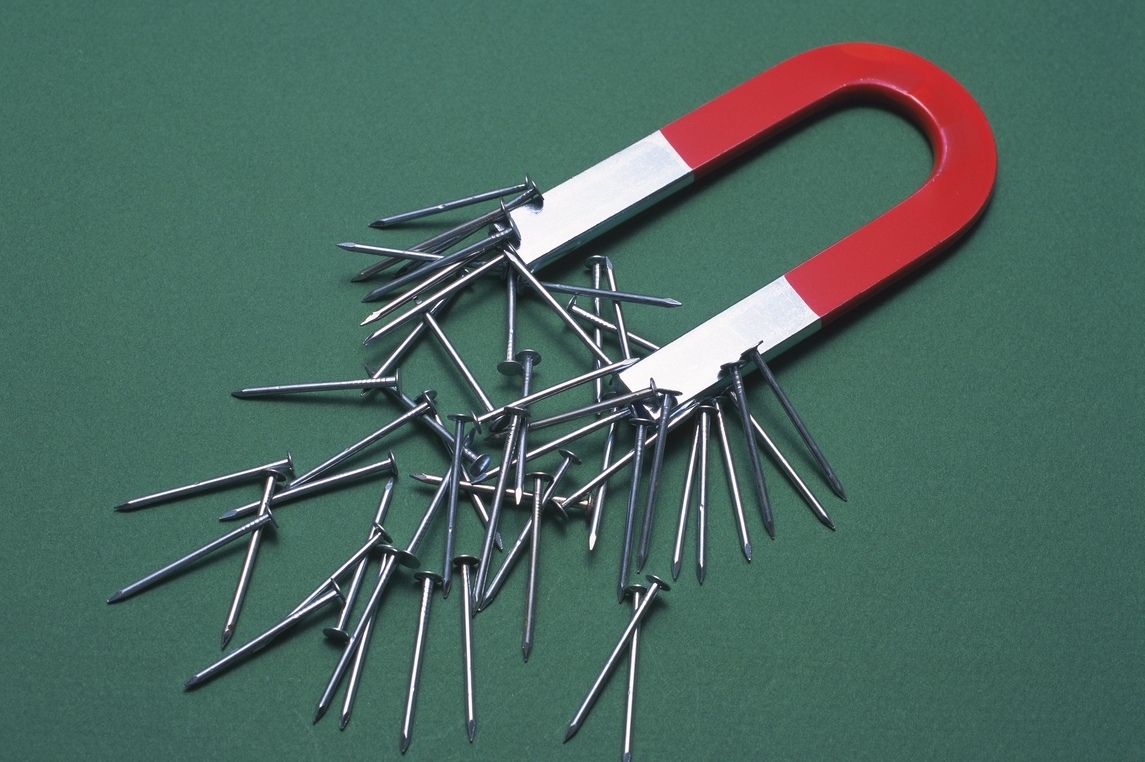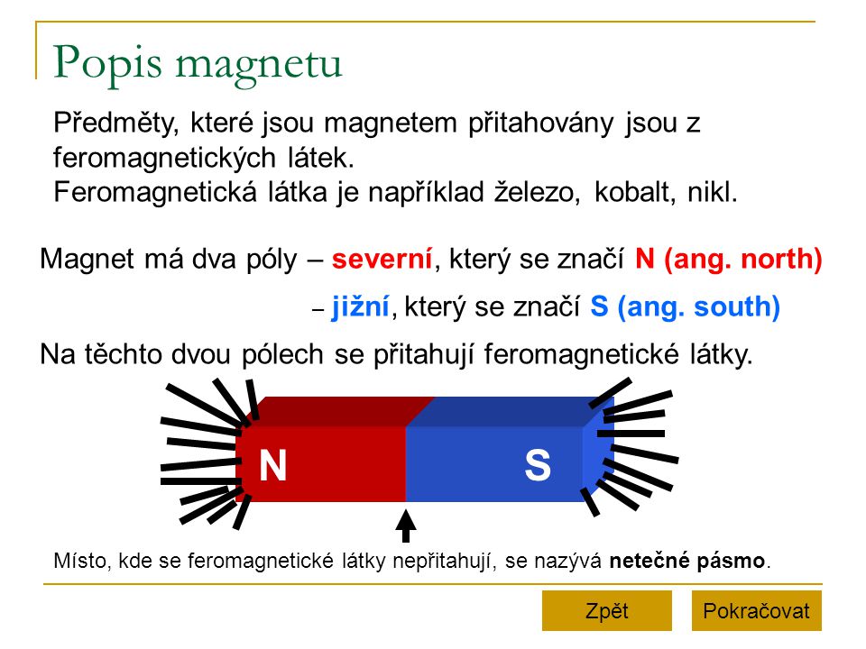 Části, kde se na magnetu zachytí nejvíce hřebíčků, nazýváme póly magnetu.