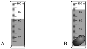 1. Zvolíme vhodný válec a nalijeme do něj vodu a určíme její objem (obr. A).