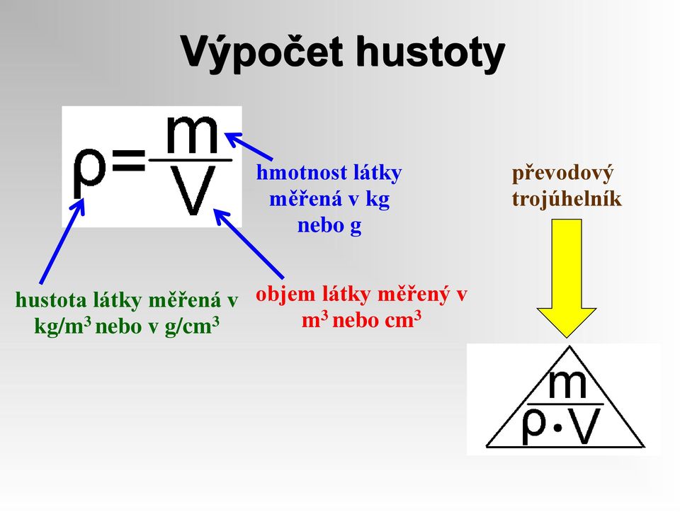 Ze vzorce na výpočet hustoty (ρ = m:V) lze vypočítat z hustoty a hmotnosti i objem (V = m:ρ) a také z hustoty a objemu vypočítáme hmotnost (m = ρ.V)