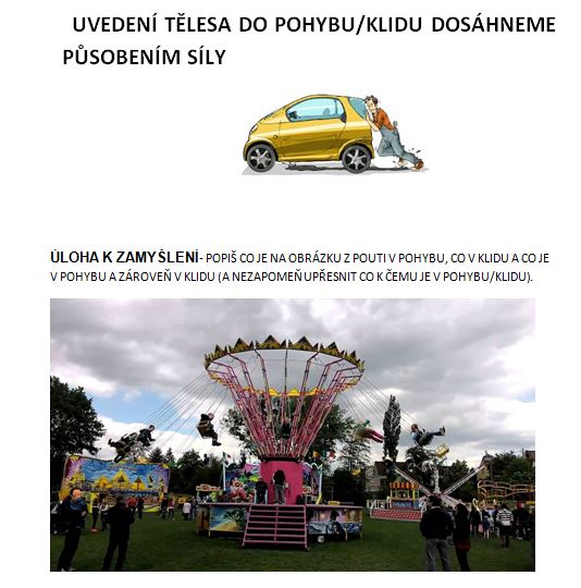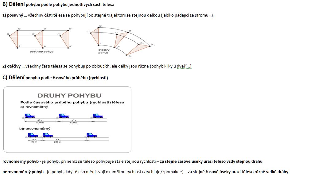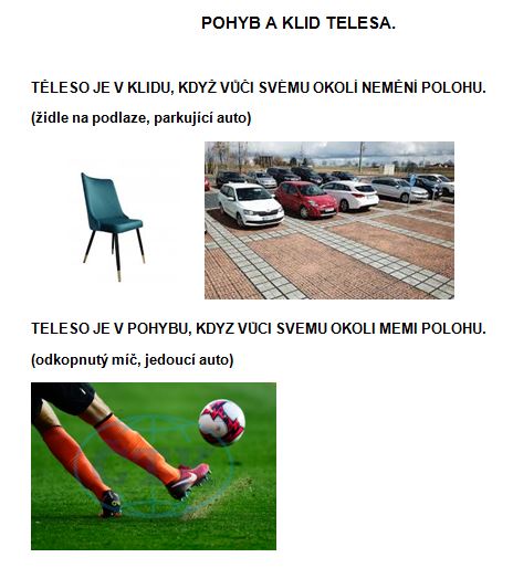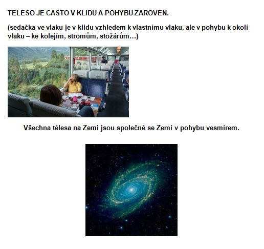 Pohyb tělesa - znamená změnu polohy vůči jinému tělesu. Klid tělesa - znamená, že se vůči jinému tělesu nepohybuje. Totéž těleso může být vůči jednomu tělesu v klidu a vůči jinému tělesu v pohybu.