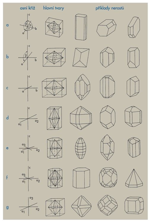 a) trojklonná (triklinická) krystalová soustava. Všechny osy osového kříže jsou různě dlouhé a svírají libovolný kosý úhel (nikoli pravý). Albit- živec sodnovápenatý, modrá skalice, kaolinit, plagioklas